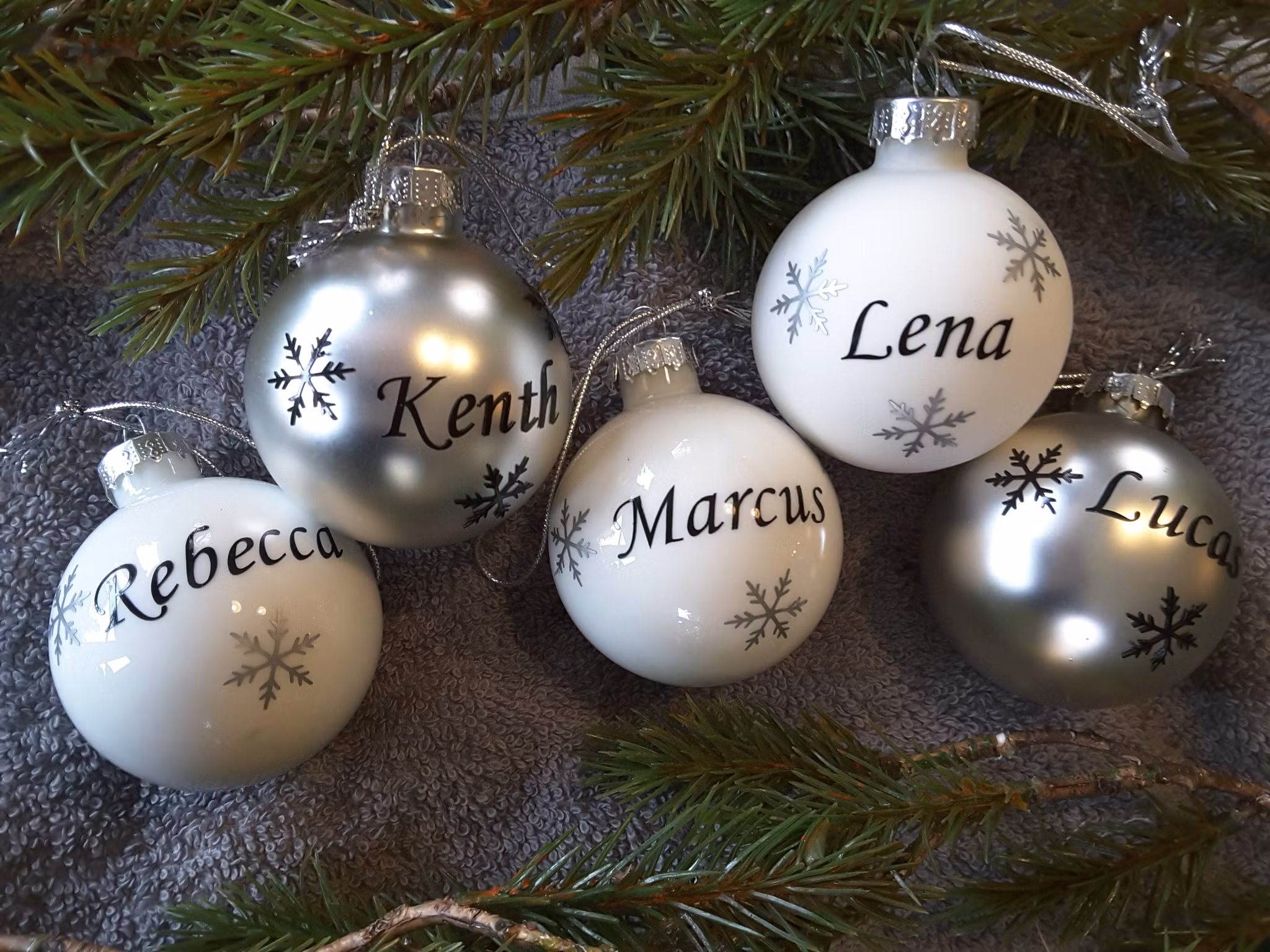 Förvandla din julgran till en personlig och magisk syn med våra exklusiva julkulor! Våra julkulor mäter ca. 8 cm i diameter och är det perfekta tillskottet till din festliga dekoration. Varje kula är unikt anpassad med ett namn efter ditt val, vilket gör dem till den perfekta personliga presenten eller minnesvärda detaljen för ditt eget hem. *Höjdpunkter:** - **Personlig Touch:** Ge dina nära och kära en speciell överraskning med deras namn på en vacker julkula. - **Exklusiv Design:** Tre eleganta snöflingor pryder varje kula och ger den en sofistikerad och vinterlig känsla. - Dessa julkulor är inte bara dekorationer; de är meningsfulla inslag som skapar oförglömliga minnen under högtiden. Perfekt för att hänga på granen, använda som bordsdekoration eller ge bort som en unik present!